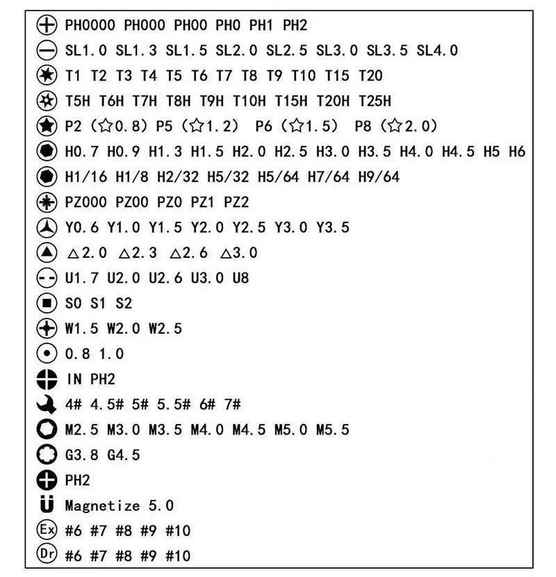 Torx: T3, T3, T4, T4, T5, T5, T6, T6, T7, T7, T8, T8, T9, T9, T10,